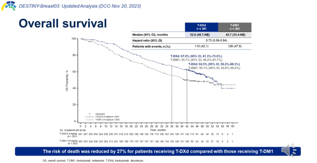 晚期乳腺癌通常被认为是不可治愈的,治疗目标之一是延长患者生存,OS是肿瘤临床研究的“金标准”,虽然OS受到新药开发使用、后线复杂的治疗选择、患者生存越来越长等影响、在临床研究观察到死亡终点的难度越来越大,但是今年ASCO公布的DB-03研究中,OS作为关键次要研究终点,T-DXd相较于T-DM1组仍获得了OS的显著延长(其中在T-DM1组有1/3的患者后续交叉使用T-DXd)。既往HER2阳性乳腺癌2线及后线治疗研究的OS一般在20~30个月,此次公布的DB-03研究中T-DXd中位OS达到了52.6个月,远远突破了同类治疗的生存瓶颈,甚至接近一线CLEOPATRA研究57.1个月的OS,极大改善了HER2阳性晚期乳腺癌患者的生存预后,进一步支持了好药先用的理念。