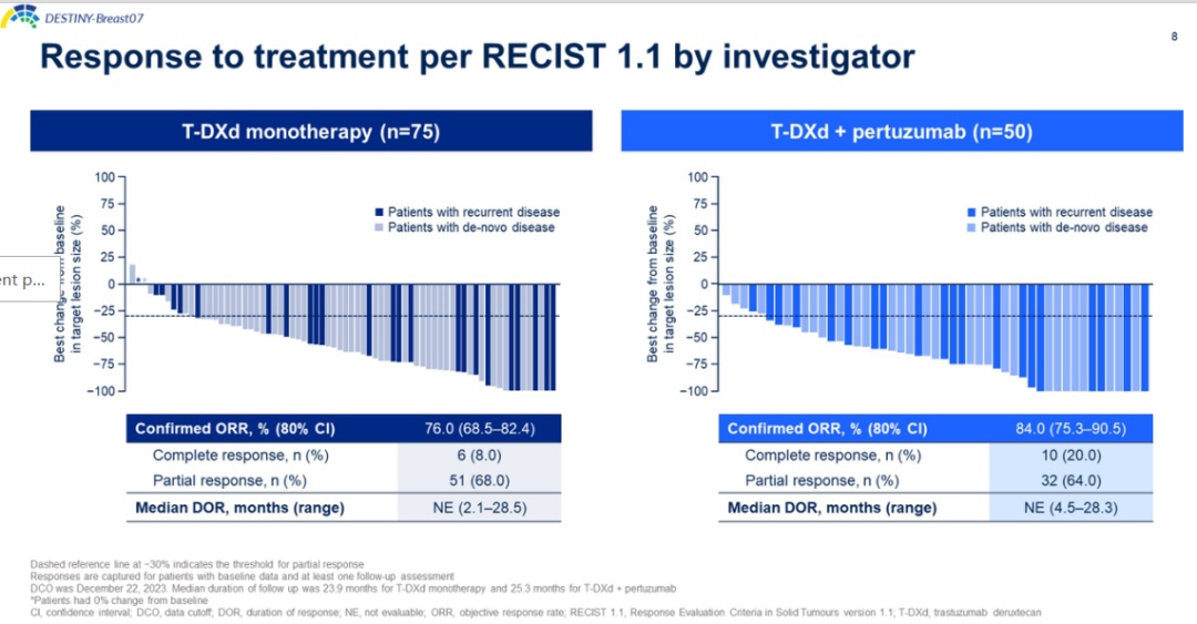 T-DXd在二线取得了很好的疗效,一线治疗疗效如何呢?DB-07研究首次报道了T-DXd在HER2阳性转移性乳腺癌一线治疗的数据,T-DXd单药和T-DXd+帕妥珠单抗均展示出惊艳的疗效与安全性,尽管中位PFS还未达到,但是其中T-DXd+帕妥珠单抗组的ORR达到了84%,而CLEOPATRA研究中曲帕双靶联合多西他赛的ORR为80.2%,这使得我们更加期待T-DXd在DB-09的Ⅲ期确证性临床研究结果。
